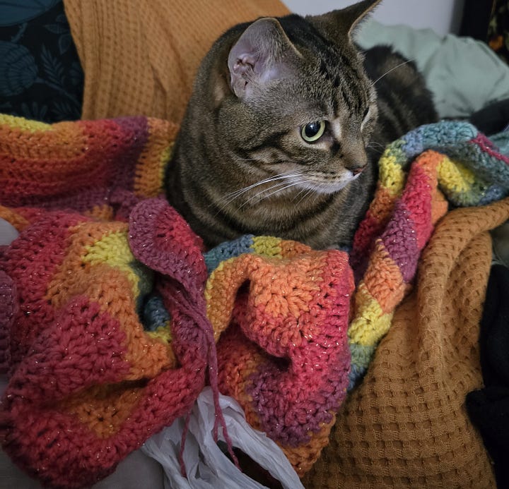 As I’ve limited my use of social media, I’ve been falling back in love with some old hobbies of mine. This month, I threw myself into several crochet projects. Two fall leaf doilies and pulling out an unfinished blanket I started 8 years ago. It’s almost finished now. I’ve already spent money I don’t have on yarn for my next blanket. Doilies are fun because they can be finished in a day. However, blankets are satisfying in how you can sit down to binge shows or chat with family, and, somewhat mindlessly, let your fingers move in subconscious creation.